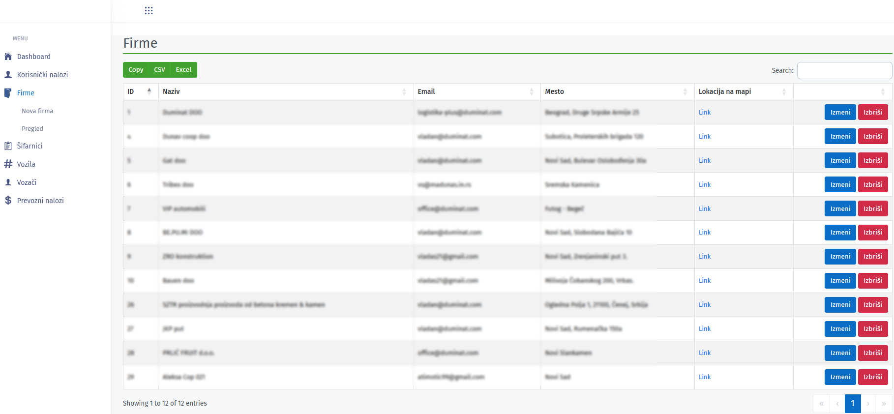 Tabelarni pregled svih dodatih firmi/klijenata uz mogućnost izmene i brisanja.