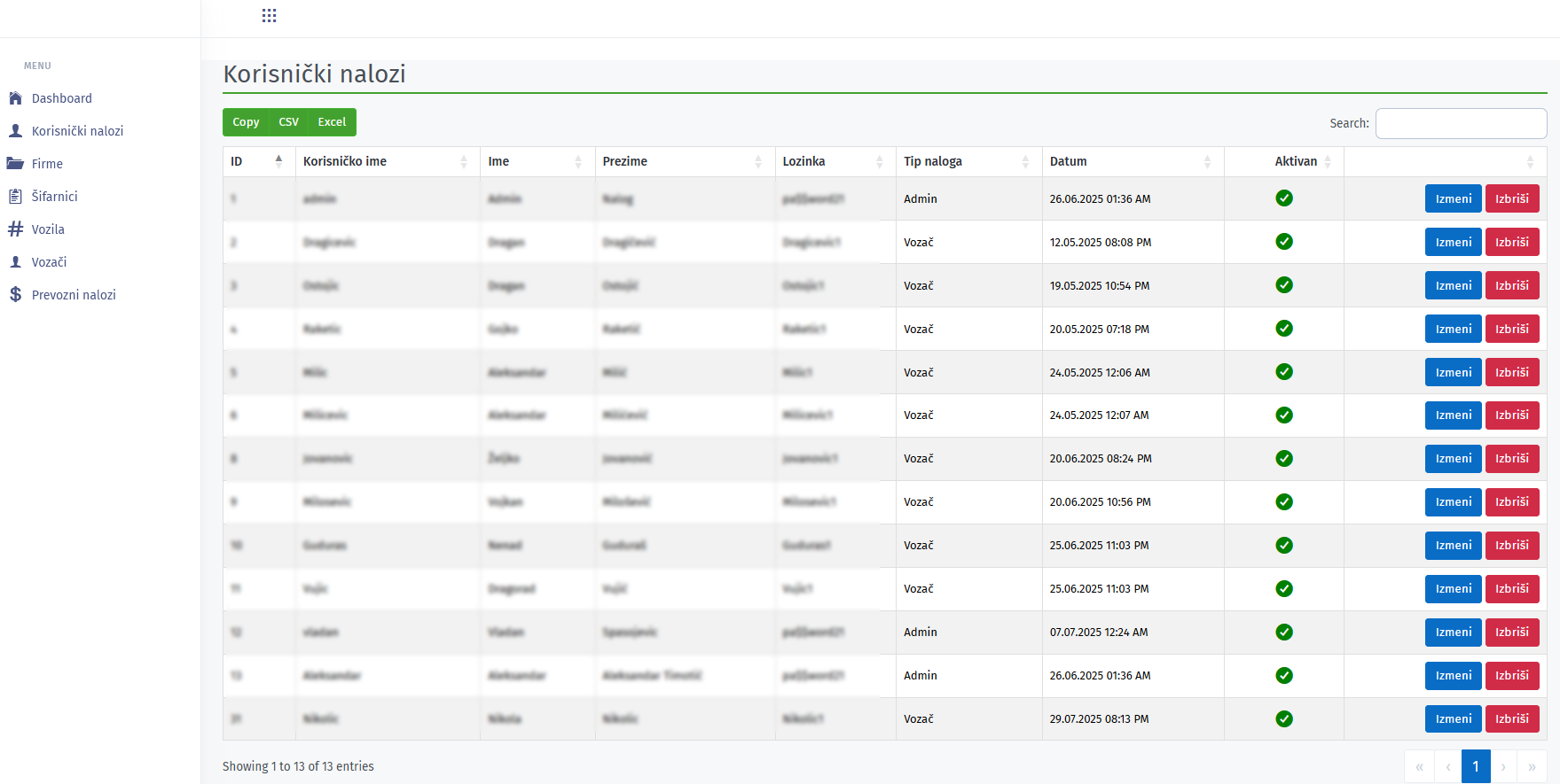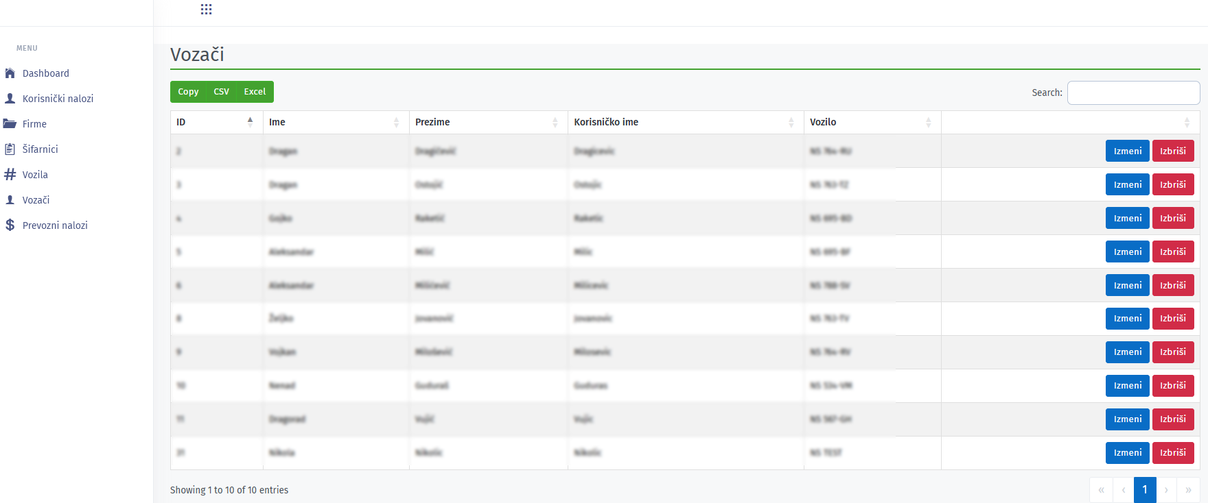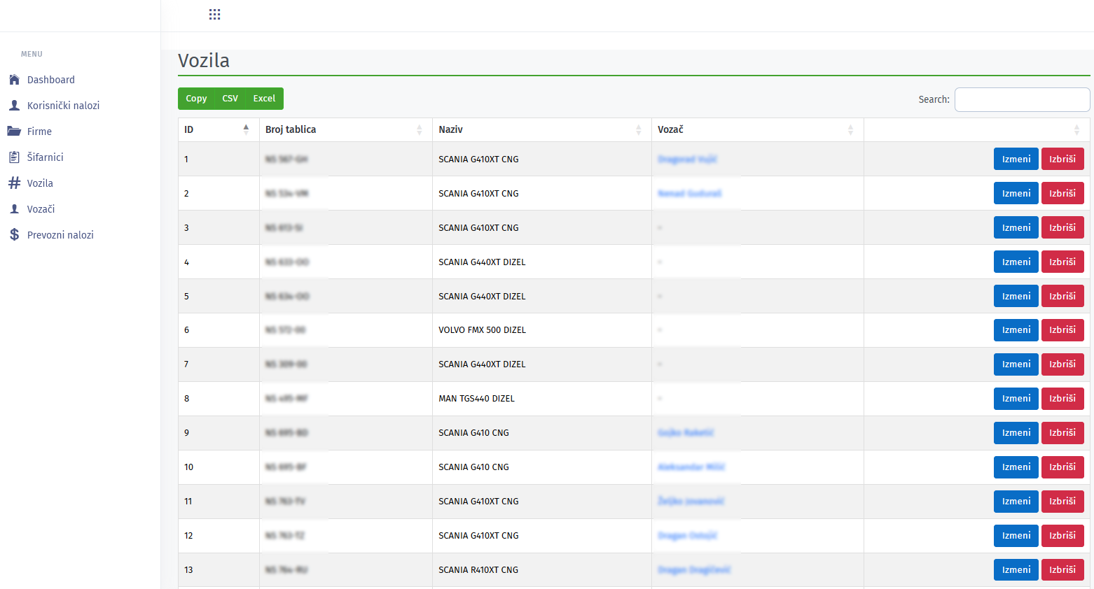 Tabelarni pregled vozača uz mogućnost izmene i brisanja istih.