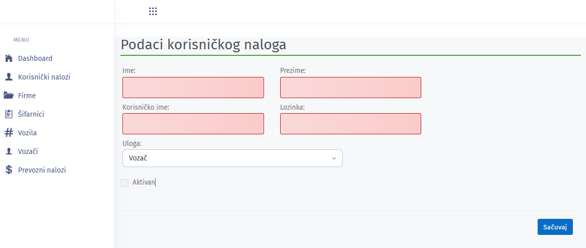 Kreiranje korisničkog naloga od strane admina. Mogu biti kreirani nalozi u ulogama vozača i admina.