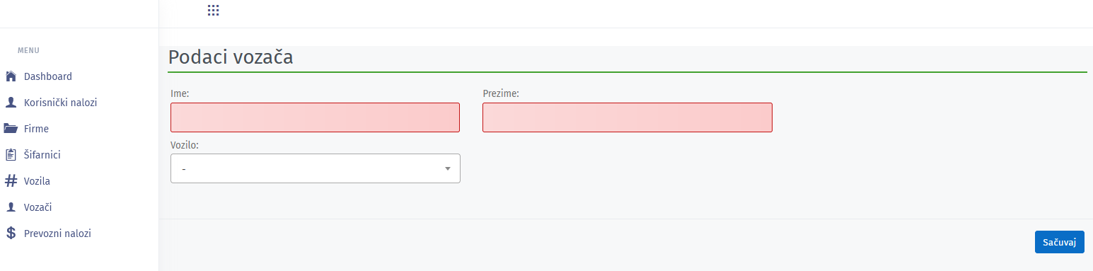 Forma za dodavanje novog vozača.