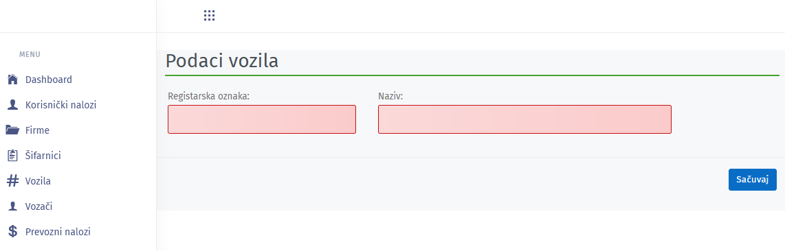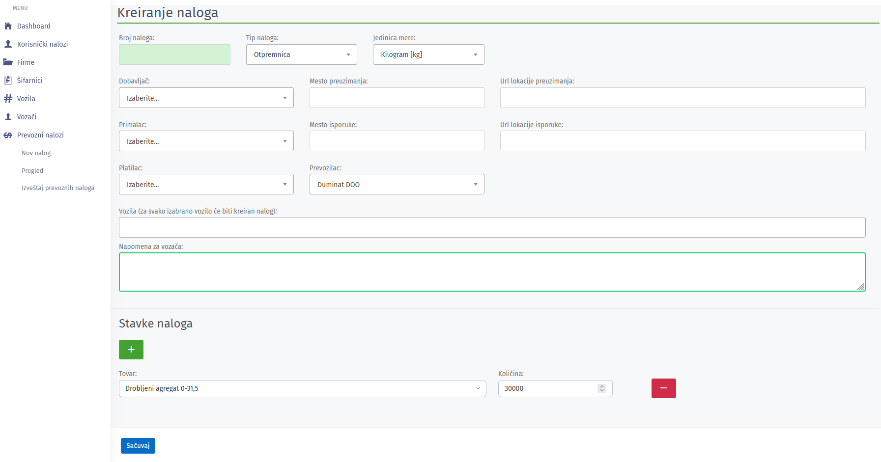 Prilikom unosa vozila se bira registarska oznaka istog iz padajuće liste. Količina predstavlja polje sa preporučenom količinom tovara.