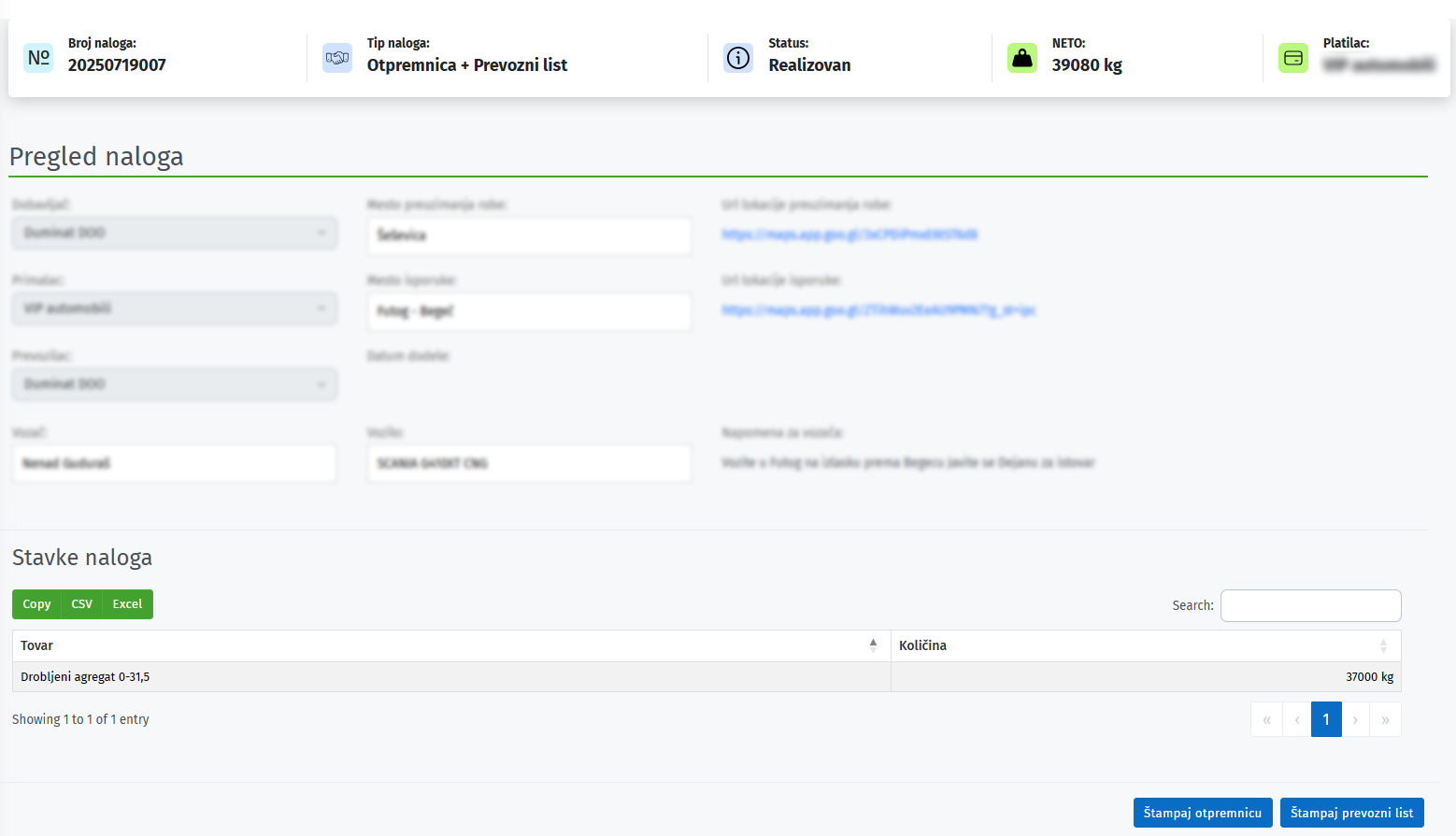 Nakon pristupa svakom nalogu, moguće je videti sve informacije istog. Klikom na dugme štampaj u donjem desnom uglu (u zavisnosti da li je kreirana samo otpremnica, prevozni list ili otpremnica + prevozni list), moguće je štampati automatski generisani dokument.