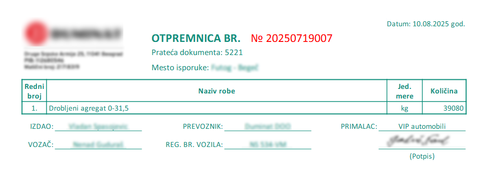 Prikaz automatski generisane otpremnice. Generisani dokument se kreira nakon unosa neophodnih podataka vozača (tačno izvagane količine materijala, broja pratećeg dokumenta i potpisa primaoca robe).