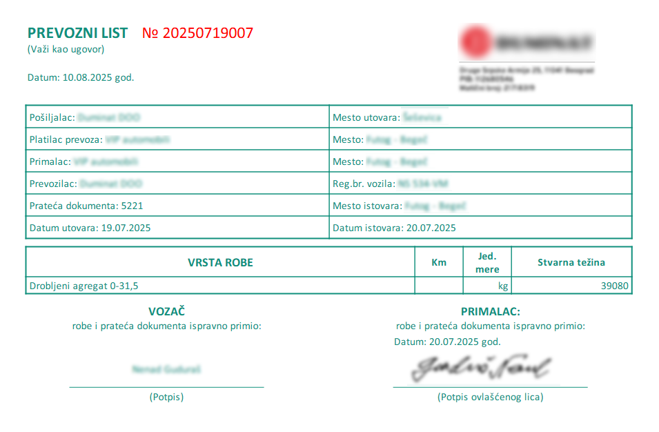 Prikaz automatski generisaog prevoznog lista. Kao i kod otpremnice, dokument se generiše nakon potvrde vozača i unosa neophodnih podataka putem aplikacije.