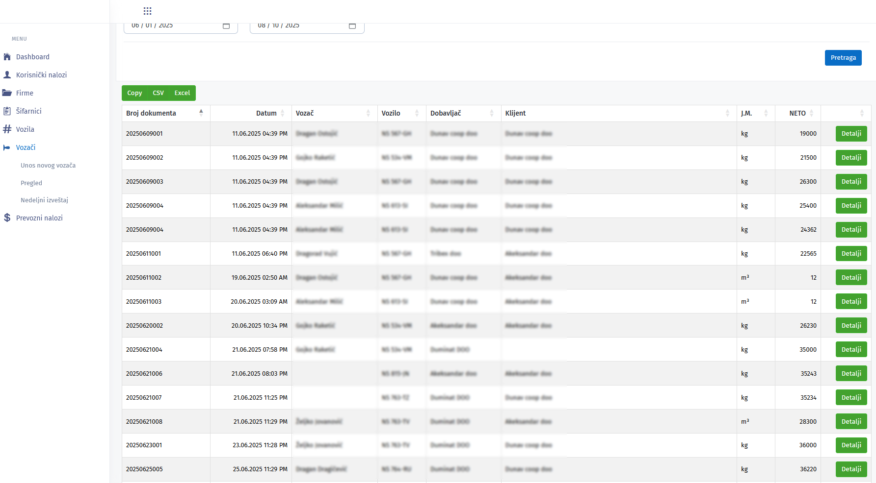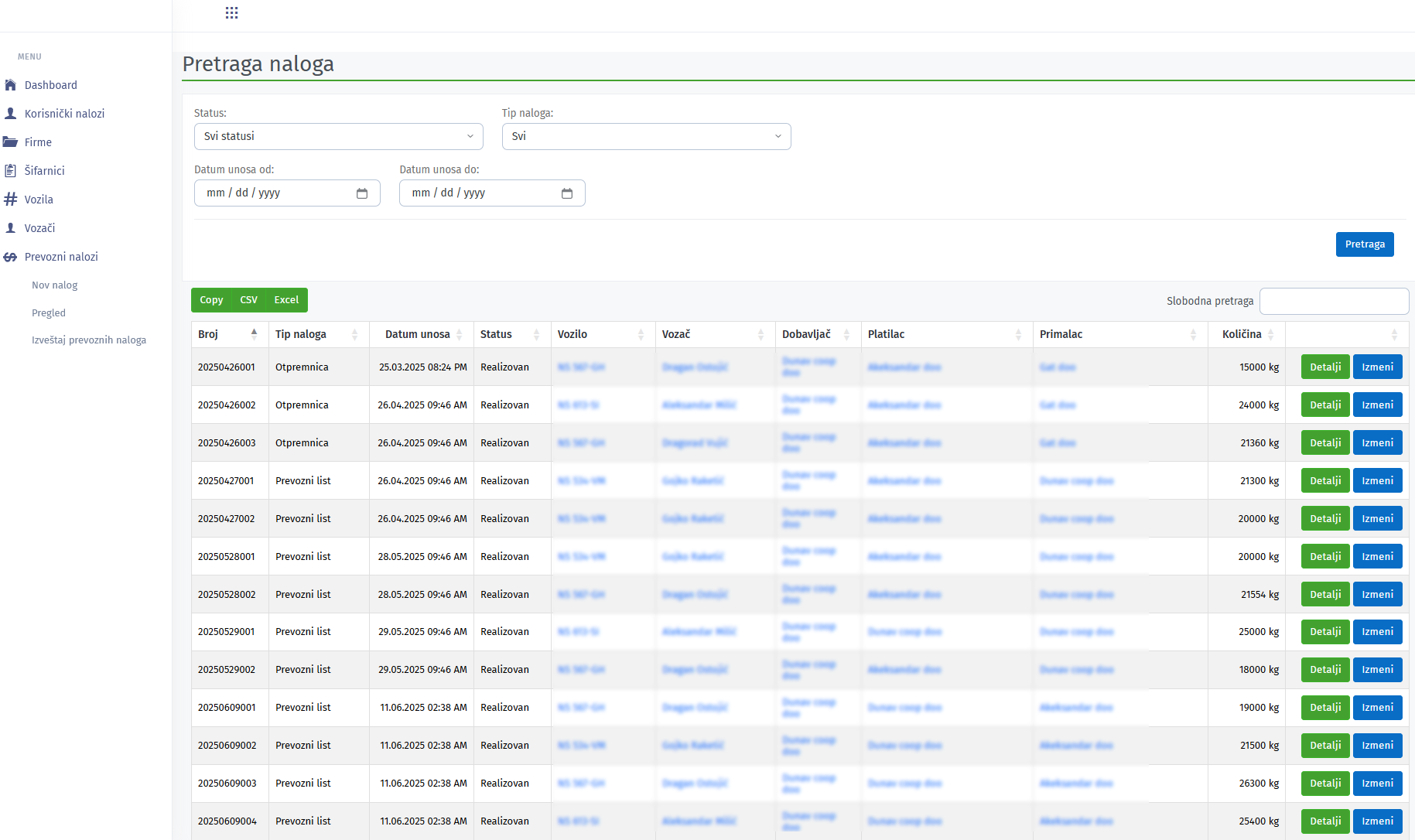Tabelarni pregled prevoznih naloga po klijentu (ili svim klijentima), tipu naloga i datumu. Moguće je pristupiti svakom nalogu putem dugmeta „Detalji“.