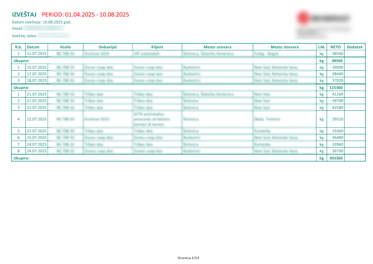 Generisani izveštaj prevoznih naloga